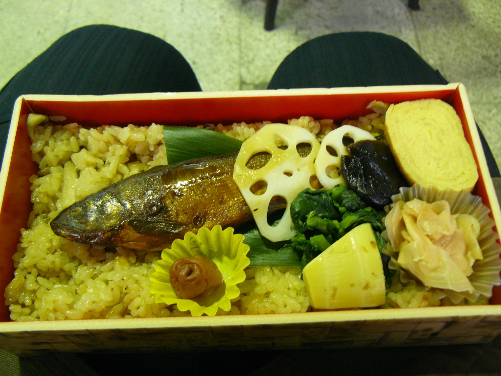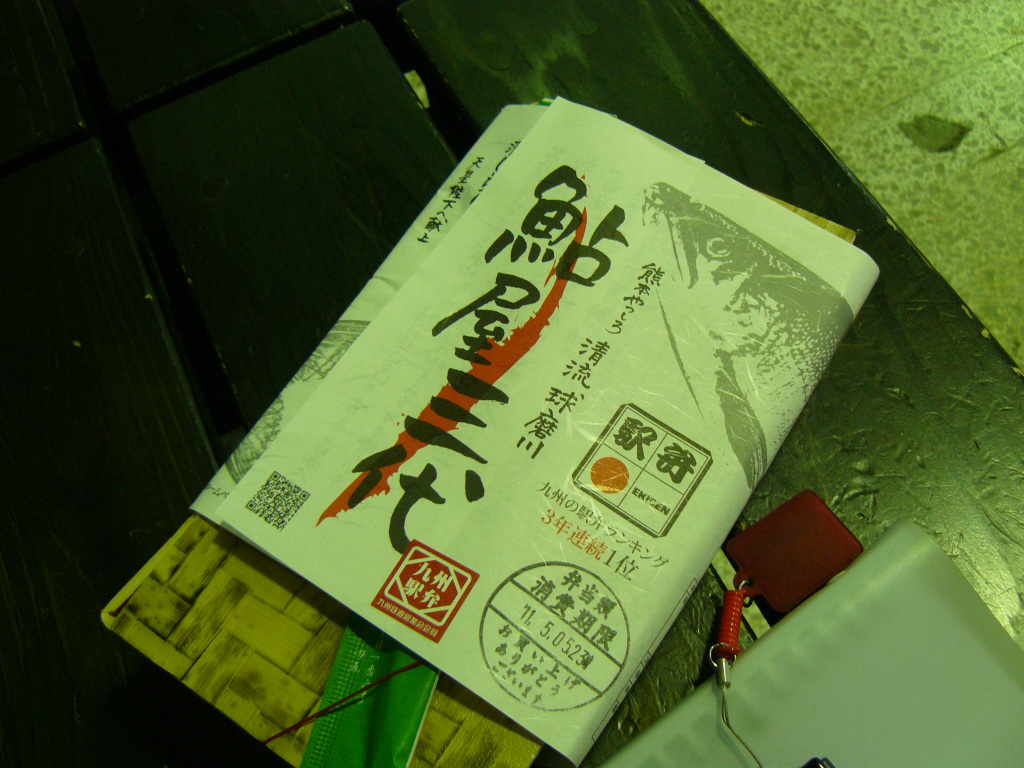 が、まだ時間があるので熊本駅で買っておいた駅弁「鮎屋三代」を食べます。