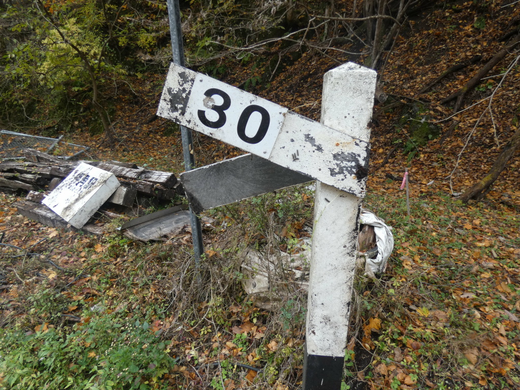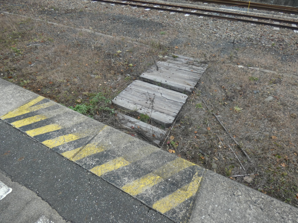 ホームから道路側への駅名標とか勾配標識。